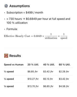 المعدل المحسوب بالساعة ل "العمل البشري" ، مع الأخذ في الاعتبار أن الروبوت أبطأ في المهام (سرعة 50/33/25٪) ومعدل الاستخدام (20/40/60٪)