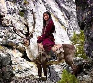 امرأة شابة تنتمي إلى قبيلة تساتان في منغوليا، آسيا الوسطى، تركب غزالا. التساتان هم قبيلة يبلغ عدد أفرادها حوالي 500 شخص، يعتبرون آخر رعاة الرنة في منغوليا.... 🇲🇳