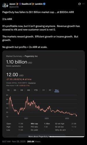 PagerDuty hat gerade eine Marktkapitalisierung von 1,1 Milliarden Dollar bei 500 Millionen Dollar ARR erreicht. Das sind 2,1x Umsatz für ein profitables Unternehmen, das 15 Jahre gebraucht hat, um aufgebaut zu werden.