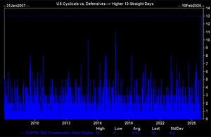 US cyclicals vs. defensives up 13 days in a row Only see moves like this when the market is starting to lean into a better growth outlook.