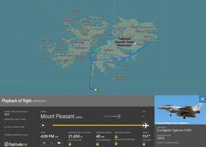 Un par de @RoyalAirForce (🇬🇧) Eurofighter Typhoons realizaron un breve vuelo ayer, haciendo algunas patrullas alrededor de la isla oriental desde RAF Mount Pleasant.