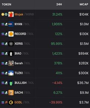 Les pièces tendance en ce moment sur Solana et BNB : $Wojak $Nyan $Record $Xeris $Biao $Sarah $Tuzki $Bullish $Sachi $Godl 🤖: