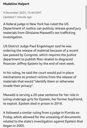 Hakim federal kedua baru saja menyetujui rilis materi dewan juri Epstein (Maxwell) berdasarkan Undang-Undang Transparansi File Epstein @RepRoKhanna dan saya mengantarkan Kongres (dan Trump menandatangani). Itu terjadi.