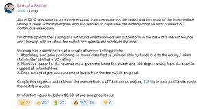 Il trader Eugene ha dichiarato nel suo canale personale: “Rialzista su $UNI, dal 10 ottobre, tutte le varie altcoin hanno subito un enorme ritracciamento, e penso che la maggior parte della pressione di vendita a medio termine sia finita. Quasi tutti gli investitori che volevano tagliare le perdite sono già usciti dopo cinque settimane di ritracciamento.