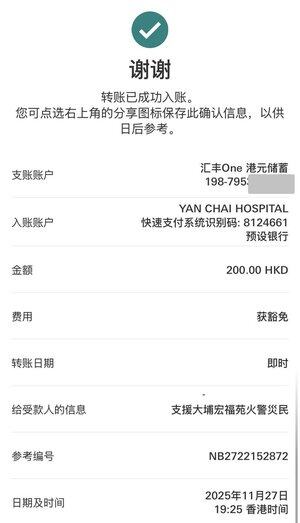 Ho donato 200 al fondo di emergenza per il incendio a Tai Po, Hong Kong.