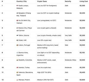このツイートは20万回以上閲覧されました そこでChatGPTに、住みやすい国を以下に基づいてランキングしてもらいました: - 暗号資産税 -安全 - 生活費(快適な生活のための)