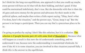 イーロンの言う通り、長期的な人間とAIの融合こそが唯一の本当の答えだ。そうでなければ人間は無意味になってしまう...