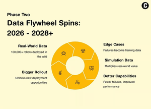 RLHF og simulering til real-trening vil bli rutine. Svinghjulet begynner å spinne: flere virkelige kanttilfeller fører til bedre simuleringsdata, som igjen fører til færre feil, og dermed større utrullinger.