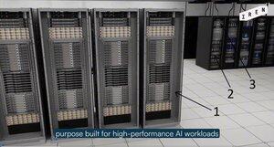 IREN fremhever også fleksibiliteten til Horizon DC-designene, med muligheten til å tilby ulike rack-tettheter inne i samme DC-skall. Dette ble en gang oversett. Men med fremveksten av levedyktigheten til andre ikke-GPU silisiumprosesseringskraft, vil evnen til å huse ulike arbeidsmengder side om side være svært verdifull. I denne versjonen fra videoen kan vi tydelig se GB300-rackene (1). Vi ser imidlertid også annen maskinvare i samme datahall, med Dell XE9680/XE9680L-servere vist (2) i samme rack som det som ser ut til å være Dell XE9640-servere (3).