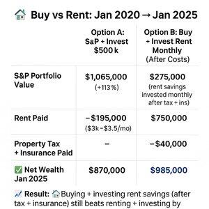 Als je in plaats daarvan een huis voor $500k had gekocht en de huur in de S&P had geïnvesteerd, eindig je met $985k!