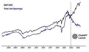 Maar hier is wat dit wild maakt. Het aantal vacatures piekte op 12 miljoen in 2022 en daalde tegen eind 2023 tot onder de 8 miljoen. Dat zijn 4 miljoen minder open posities. In dezelfde periode steeg de S&P met 30% omdat de markt besloot dat uitgaven aan AI-infrastructuur belangrijker zijn dan arbeidskosten.