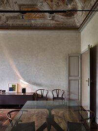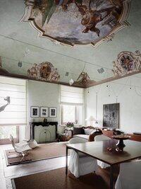Эта кухня в североитальянской квартире на уровне неосвоенной территории поразительна. Высокий потолок, украшенный фресками, полный шкаф из нержавеющей стали с деревянной столешницей и терракотовый пол!