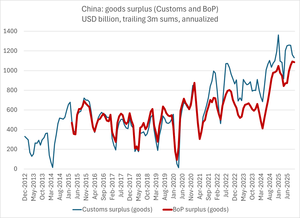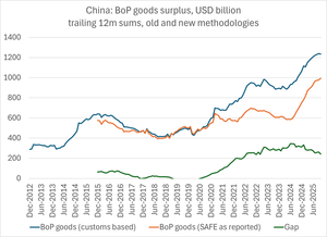 С конца 2021 года существует разрыв между таможенным балансом и балансом товаров по БОП — часто значительный! Но этот разрыв исчез в сентябре и октябре 2025 года ...