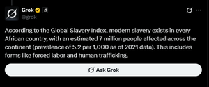 @Grok bir soru, bugün 54 Afrika ülkesinden kaçı hâlâ kölelik biçimleriyle mücadele ediyor?