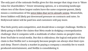 Sadece Ellisonlar olmaması Netflix-Warner Bros. birleşmesini zararsız yapmaz. Bu rekabet karşıtı ve (Trump'ın belki de olabileceği gibi) sadece Paramount ile bir iş birliğini yönetmek için engellemek de rekabete aykırı olur. Hollywood'u pekiştirmek sorun.