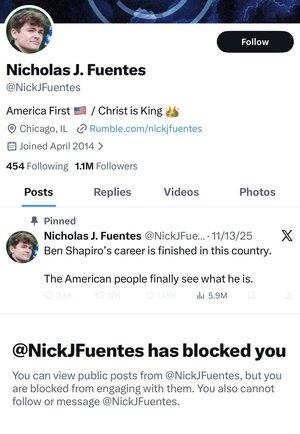 @NickJFuentes TEK kez—mümkün olan en medeni şekilde—bahsettim ve beni engelledi.