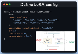 Tüm model ağırlıklarında ince ayar yapmaktan kaçınmak için LoRA kullanacağız. Bu kodda, Unsloth'un PEFT'sini aşağıdakileri belirterek kullanıyoruz: