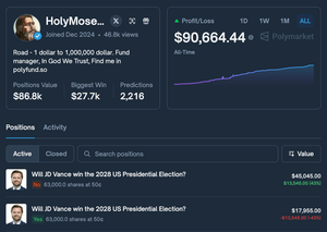 Він володіє 63 000 акцій YES та 63 000 акцій NO на тому ж виборчому ринку JD Vance 2028.