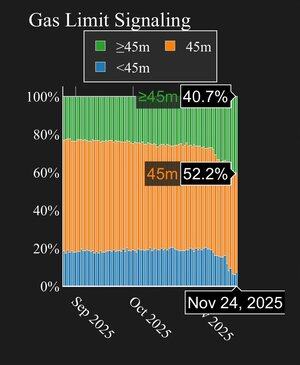 40%的验证者正在为6000万发声。超过50%将把气体限制从4500万提高,这是当前水平。 一旦稳定,这将为2025年的Ethereum主网用户提供2倍的可用区块空间。2026年将有更多消息 🫡