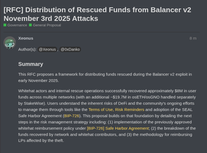 Balancer论坛上现在有一个新的讨论正在进行,征求反馈,概述了一个建议的框架,用于重新分配在最近对v2的攻击中恢复的资产,包括白帽救援和内部恢复工作。 它提出了一种补偿在恢复资产的池中流动性提供者(LP)的方法,并描述了供社区考虑的下一步。 我们始终致力于透明度,并将用户置于这一过程的中心。 链接: