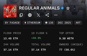 Beeple 正在 Art Basel 活动期间赠送 1024 张印刷品和 256 个 NFT。 这些免费的 NFT 目前的交易底价为 13.49 ETH,最高成交价为 11.69 ETH。 到目前为止仅铸造了 136 个,这意味着还有 120 个可以获得。