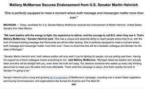 马丁·海因里希参议员在密歇根州参议院竞选中支持马洛里·麦克莫罗。 他还支持并捐款给缅因州的格雷厄姆·普拉特纳。
