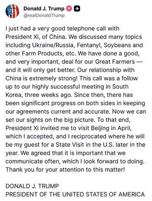 突发:特朗普表示他刚刚与中国的习近平进行了非常好的通话