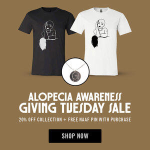 在我的网站上购买脱发意识系列商品可享受全场 20% 的折扣,庆祝给予星期二 💛 所有收益将捐赠给 @NAAF_org 👩🏻🦲
