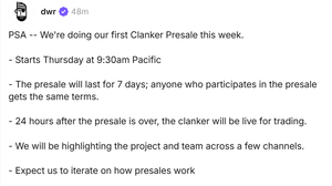 【Farcaster 聯創:首次 Clanker 預售將於 12 月 5 日凌晨 1:30 開啟】 去中心化社交協議 Farcaster 聯合創始人 @dwr 表示,本週將進行首次 Clanker 預售,預售將於太平洋時間週四上午 9:30 開始(北京時間 12 月 5 日凌晨 1:30),預售為期 7 天,所有參與者將享有相同條款。 預售結束後 24 小時,Clanker 將上線交易。Dan Romero 表示將在多個渠道介紹項目及團隊,並計劃對預售機制進行改進。