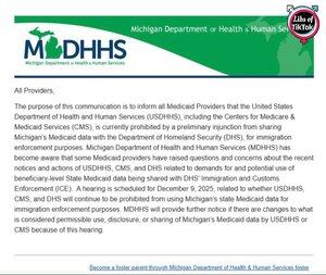 獨家消息:密西根州健康與人類服務部向所有醫療提供者發送了這封電子郵件,警告他們不要與DHS分享任何移民目的的數據 但民主黨堅持非法移民並未獲得福利…… 為什麼民主黨想要隱瞞ICE的數據??🤔