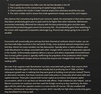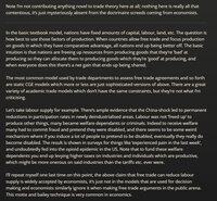 反對教條式自由貿易的論點: (1) 勞動市場的傷害 (2) 人力資本的損失(在工作中學到的技能,而非學校教育) (3) 實體資本的損失(機器) (4) 配置性/李嘉圖的好處是一種一次性的意外之財,而行業的生產力增長則是持續的。