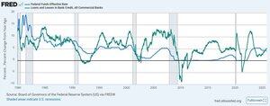 現在,看看最近的有效聯邦基金利率(EFFR)和銀行信貸中的貸款/租賃數據,你看到了什麼?